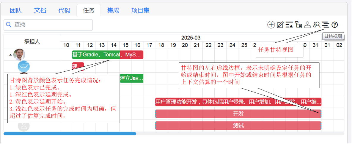 任务承担人是任务的实际执行人。任务计划人、项目管理员可以为任务分配任务承担人。对于尚未分配承担人的任务,团队成员可以主动选择承担该任务。